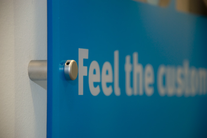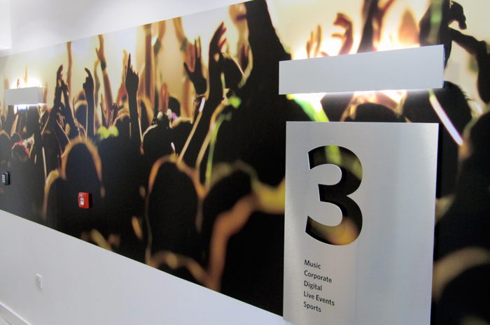 This high-end solution to way-finding signage offers a clear and bold feature to any working floor. Diamond polished edges, off-wall fixings and high quality print finish this product off beautifully.