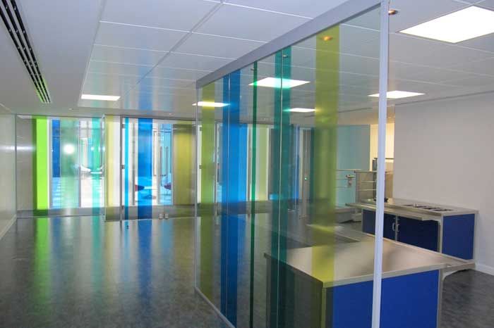 Graphic Image were enlisted to supply and install coloured-transparent films to interior glazing. The pattern was to remain random with different colours used on each elevation with different spacing between each strip. This gave each office a unique look. The project was split over six floors and took eight weeks to complete.